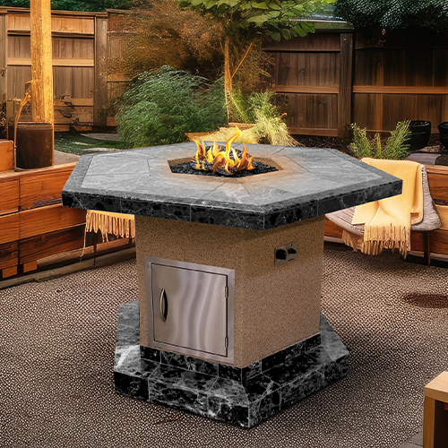The tabletop is a 61in hexagon shape with a height of 45in. The height of the FPT-1050T is the same as a bar. The square firebox has a BTU output of 55,000 and comes equipped with an everlasting 4-piece 16in log set with lava rocks.